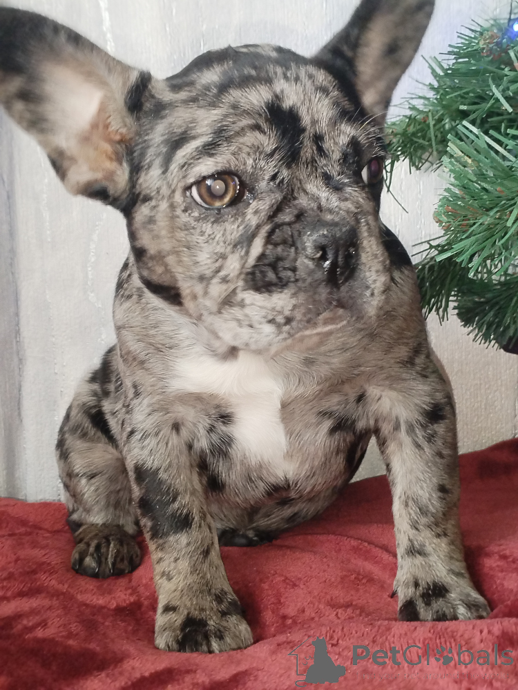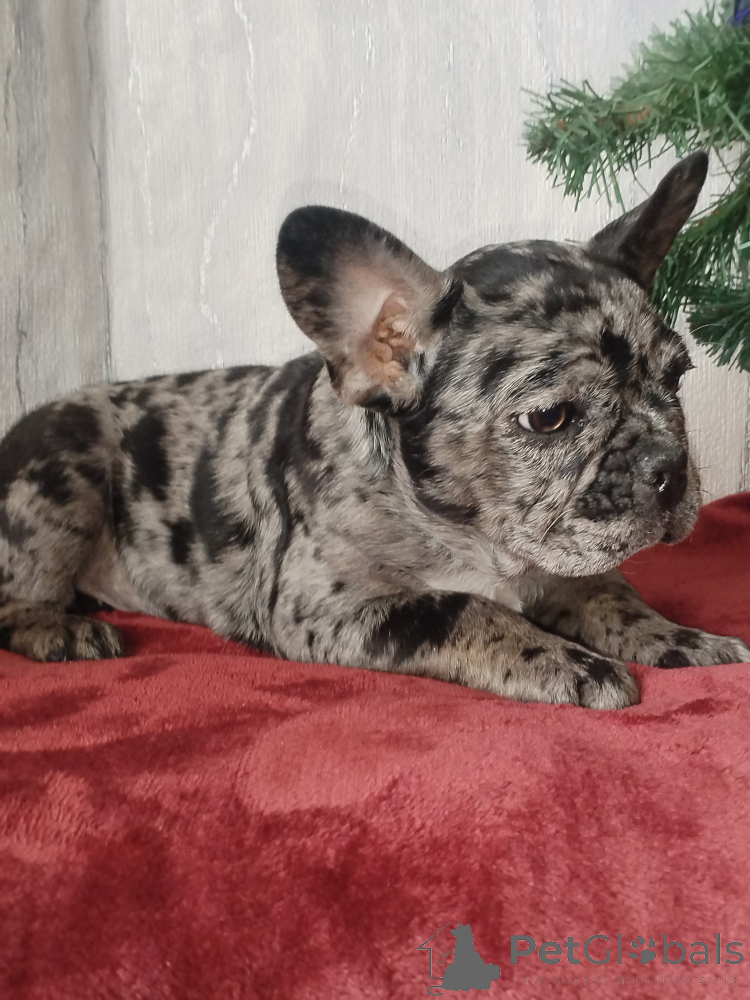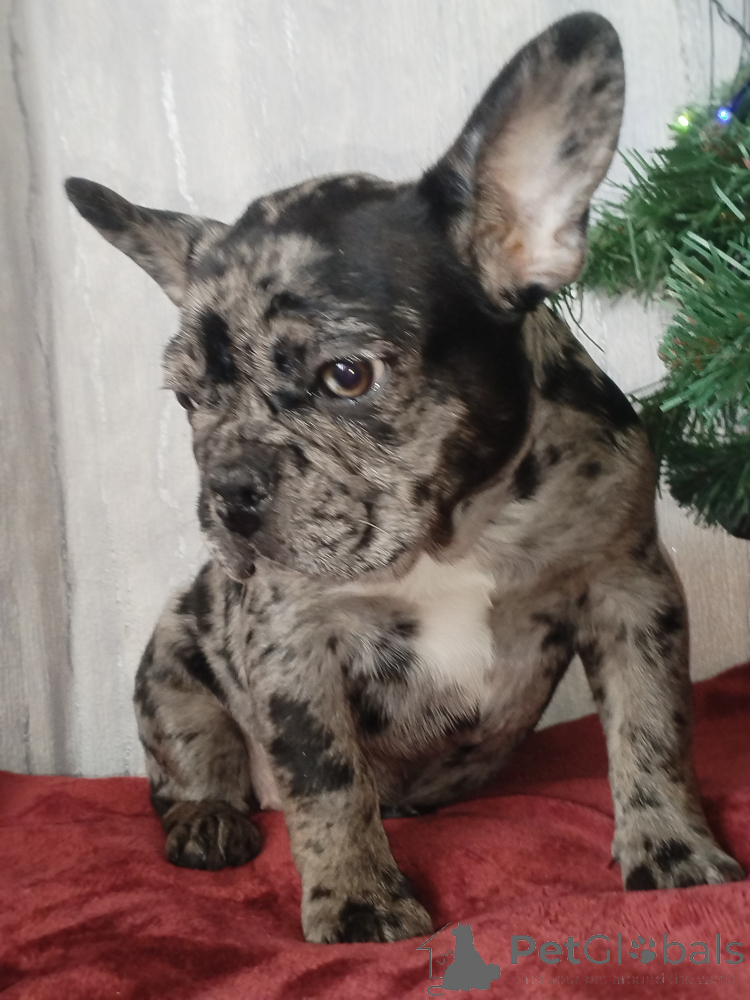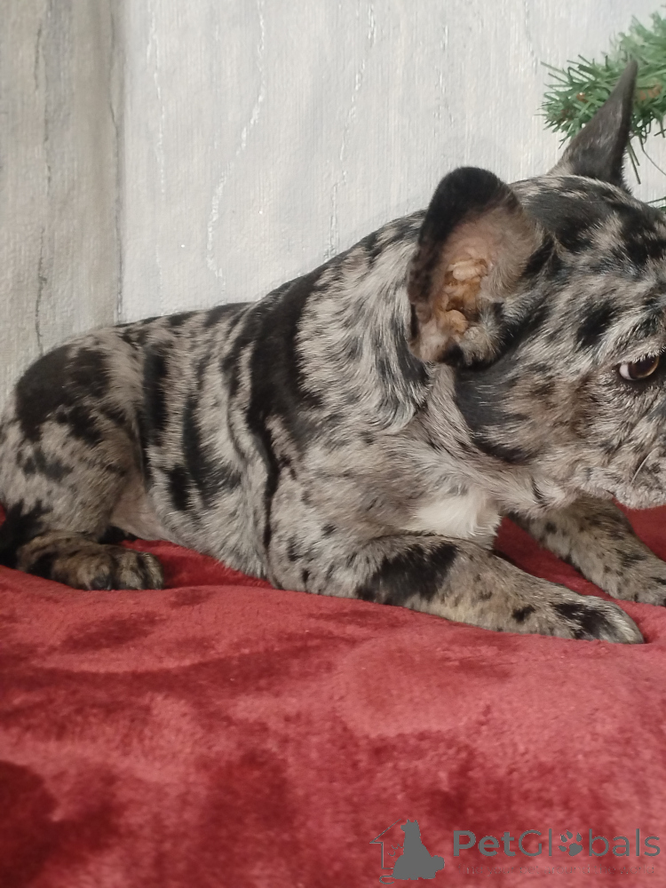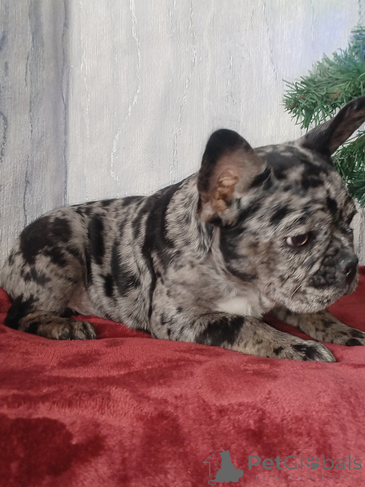 Щенок французского бульдога , девочка. Окрас голубой мерль. Полностью привита. Очень игривая, смышлёная, позитивная. Приучена к пелёнке.
