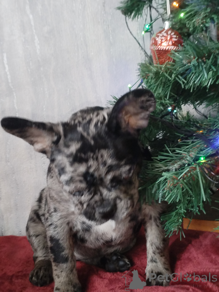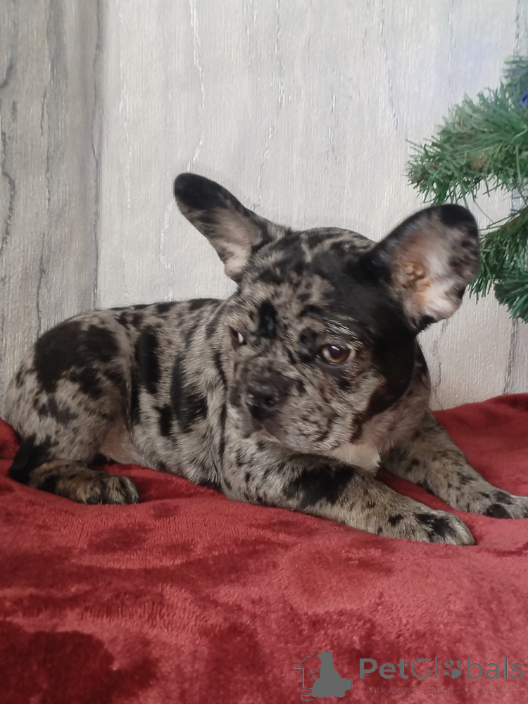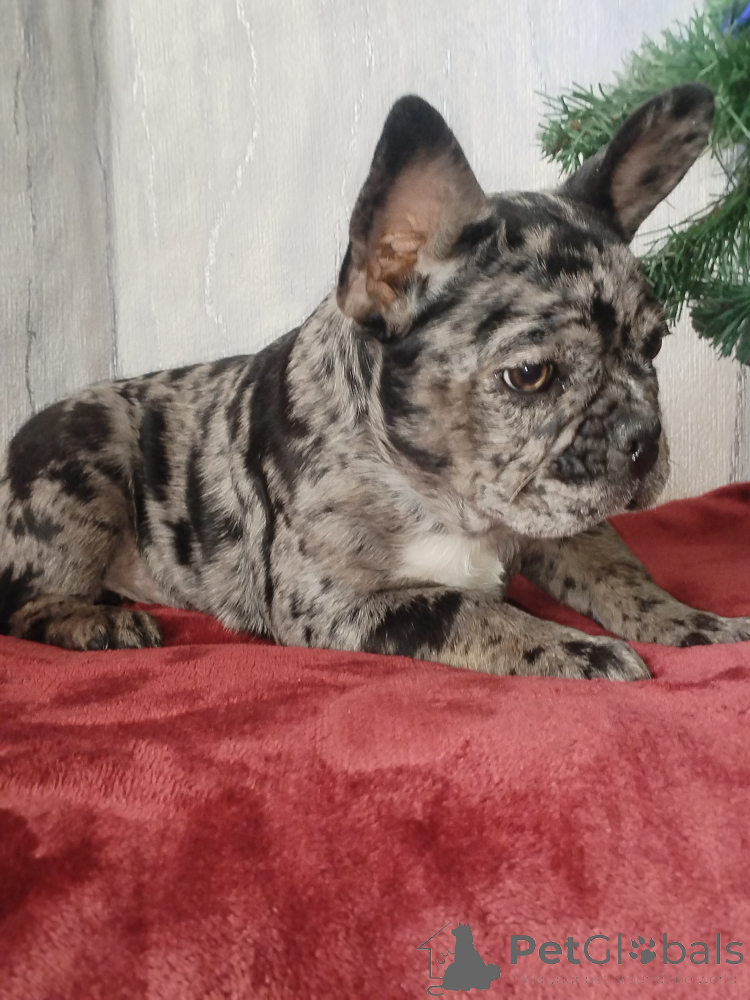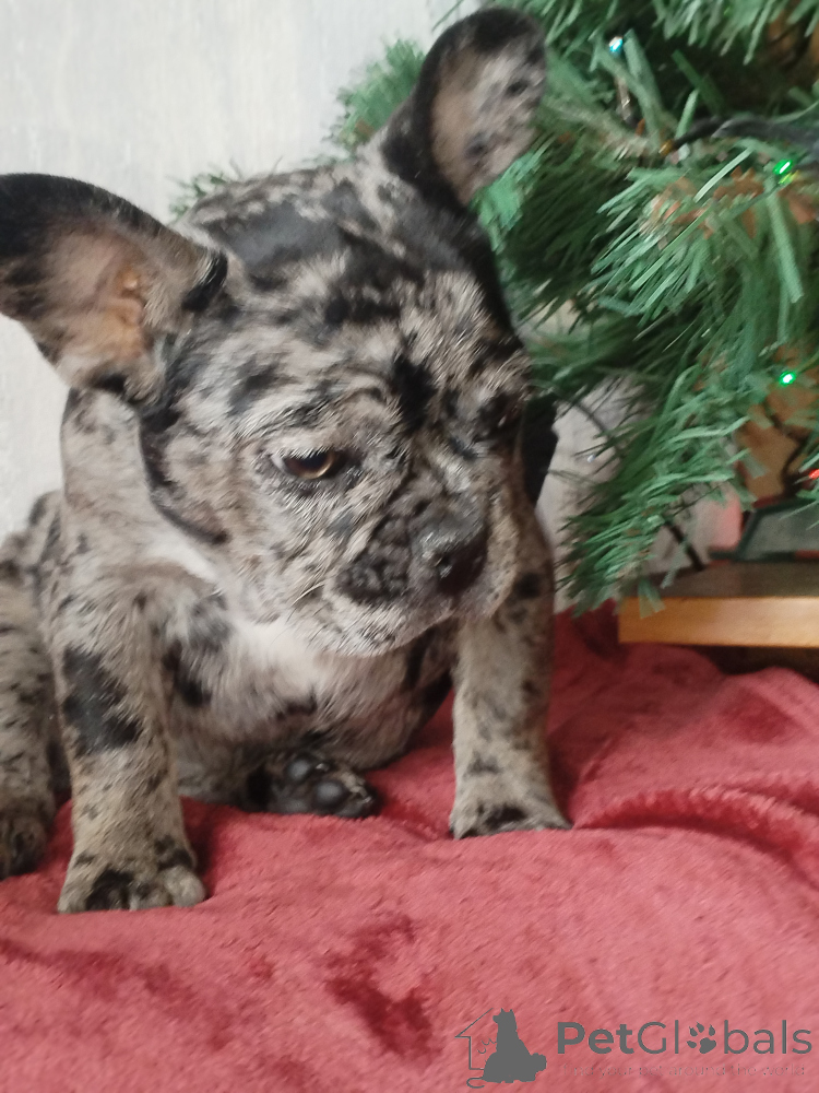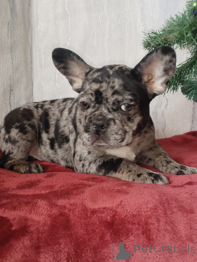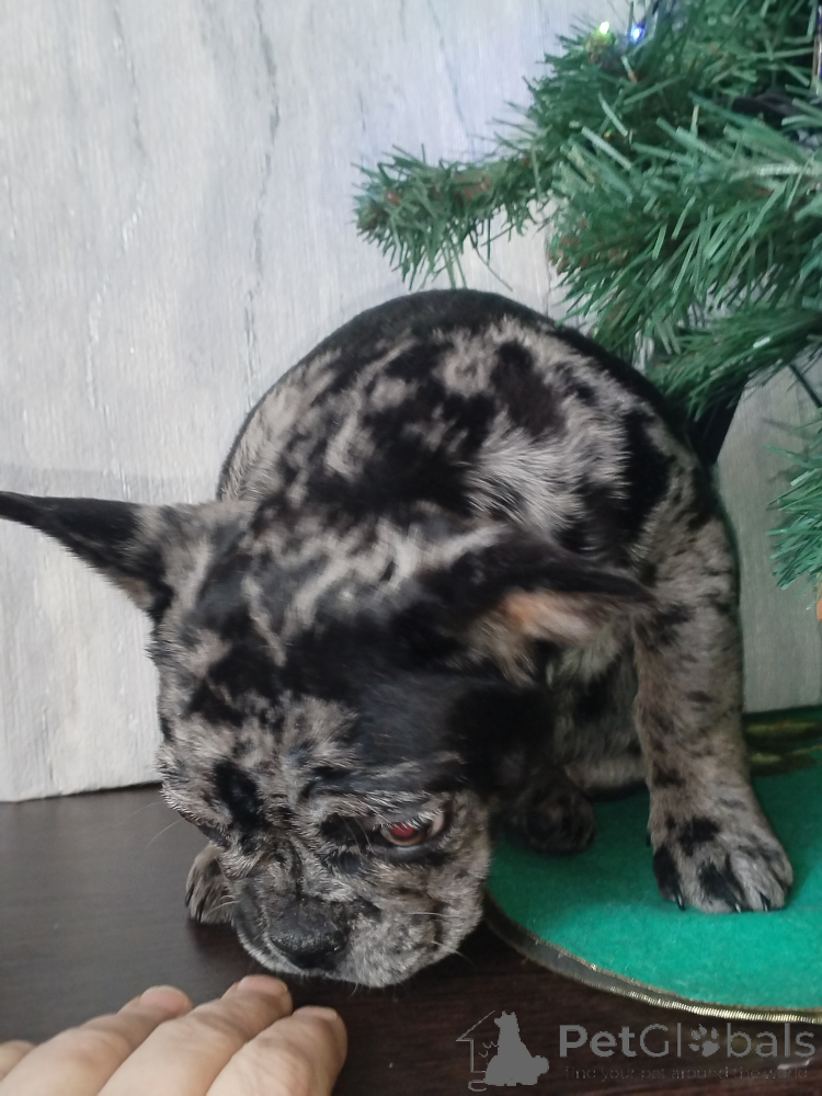 Щенок французского бульдога , девочка. Окрас голубой мерль. Полностью привита. Очень игривая, смышлёная, позитивная. Приучена к пелёнке.