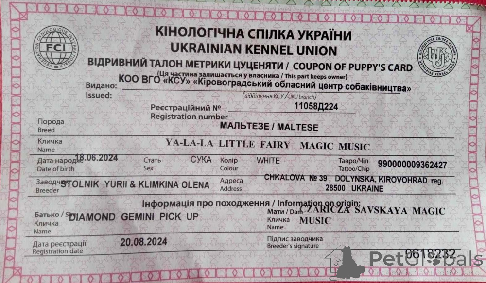 В звязку з відїздом за кордон терміново продається мальтезе клуб КСУ FCI Продам