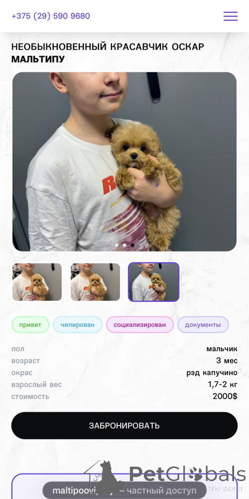 PetGlobals настоятельно рекомендует производить оплату\предоплату только после предоставления всех необходимых документов! (сертификатов, свидетельств, лицензий, паспортных данных и пр.). Сделайте Online-видеозвонок (Telegram, WhatsApp, Skype, Viber и пр.) с продавцом и попросите показать себя и питомца - как правило у мошенников ничего нет!