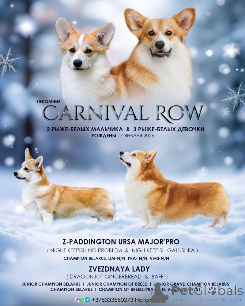 У нас 17.01.2026 года родились щенки породы вельш корги пемброк от лучших представителей своей породы. Отец З-Паддингтон Урса Маджор'про - CH BY (О- Найт Кипиш Ноу Проблем, M- Найт Кипиш Галушка) Мать щенков Звездная Леди JCH BY, JCH BREED BY, JCH GRAND BY, CH BY, CH BREED BY, (О-Dragonjoy Gingerbread, М- Baffi). На момент продажи щенки будут иметь родословную БКО (FCI), чип, ветеринарный паспорт международного образца, вакцинацию по возрасту. Щенки будут очень яркие и красивые. Возможен выезд в любую точку мира. Более подробную информацию и фото в любом мессенджере по номеру телефона.